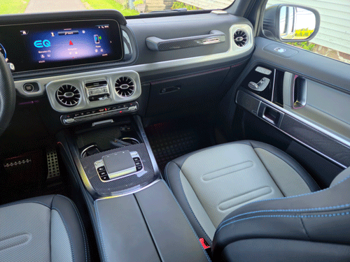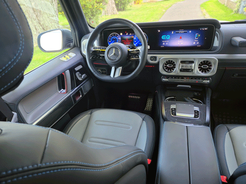 Inside, the G 580 blends old-school toughness with unmistakable modern luxury. The cabin is a warm refuge from the cold outside, wrapped in rich leathers, carbon fibre trim, and subtle blue accents that feel perfectly on theme for a vehicle born of electricity and ice.