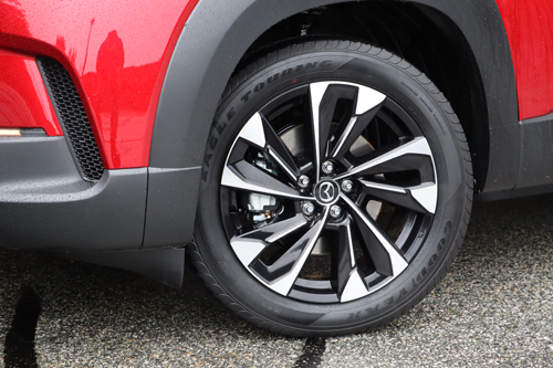 Looks-wise, you have to really know your CX-50s if you were to be able to spot the differences between the Hybrid and the other models; the Hybrid’s wheel diameter maxes out at 19 inches (other models get 20s) and there’s thicker plastic cladding ‘round the wheel wells and rocker panels – that’s it. The reason for the added plastic is not about protecting bits of the hybrid powertrain but rather a purely aesthetic exercise. The Hybrid is a little taller – we’re talking millimetres, here — so in order to accommodate the added running gear without compromising on interior space or ride height, Mazda says the added plastic helps disguise the taller stance. We’ll have to take their word for it because it’s hard to tell the difference; perhaps parking a Hybrid next to a standard model would reveal more.