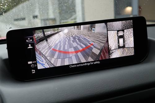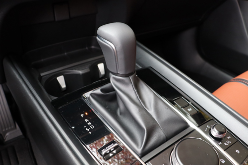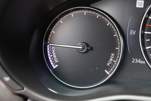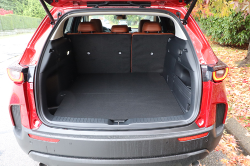 It should come as little surprise that the Hybrid’s interior is a spitting image of the standard car. That’s actually a good thing as that means the driver’s seating position is right on and the materials and fit and finish are of the highest order. Since Mazda has no luxury division, it has to drop just a little extra je ne sais quoi inside. On the GT model we sampled, that came in the form of two-tone real leather seating, a leather dash with contrast colour stitching and leather-wrapped heated steering wheel. There’s also heated and cooled front seats, heated rear seats, Bose audio (not bad, but not the best, either) and wireless Apple CarPlay and Android Auto. Which, it has to be said, proved to be a challenge to set up but eventually we did get a reliable connection. Like the exterior differences from the CX-50, the interior changed are subtle: there’s a charge/power gauge instead of a tach, a longer gearlever and in the cargo area, a cover across the wall-mounted cubby which Mazda says protects vital aspects of the hybrid system.
