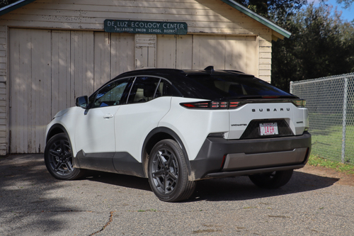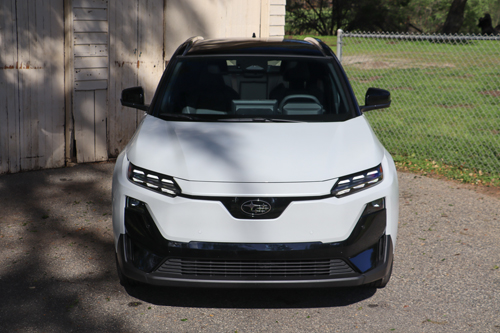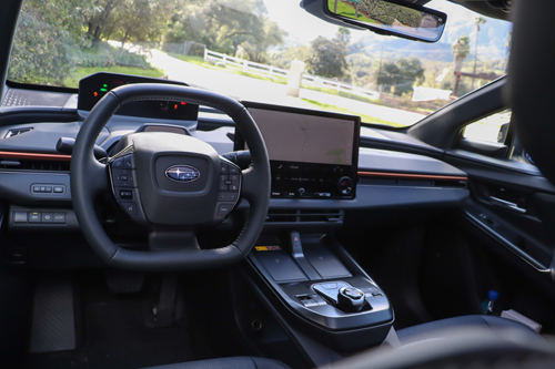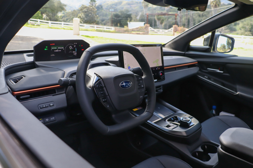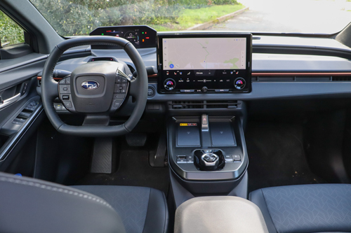 The taillights get a similar treatment, but the real eye-catching touch here is the “Subaru” scripting placed broadly across the rump. Seen here is the contrast-colour roof option; a body colour roof is standard. As are 18-inch wheels as opposed to the 20s on my top-spec GT tester, which is one of four trims. Joining the GT ($54,852) is the base model simply called “FWD” ($42,995); the FWD Long Range ($46,995); and the Sport AWD ($49,995). That means that all but the top GT spec will be eligible for the recently announced Canadian EV rebates.
