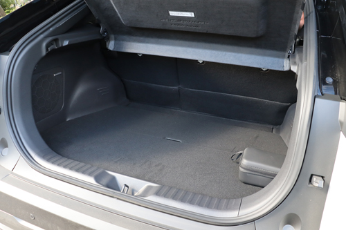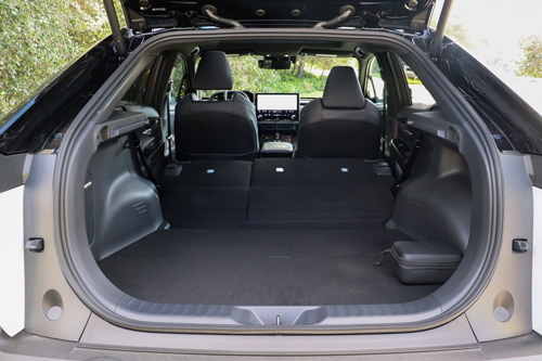 Storage-wise, you’re going to want to make use of the adjustable-height cargo floor because the steep slope of the rear glass means you can’t load things too high back there. Having the digimirror helps because your gear won’t obstruct your view out the back but remember: that comes only on the top trim. Oh, in case you’re asking: no, there is no frunk. None of the Toybaru EVs get one because that’s where they’ve stored the AC system, EV motor and so on. Luckily, the rear seats fold nice and flat with a tug of a shoulder-mounted lever, providing 1,685 litres of cargo space.