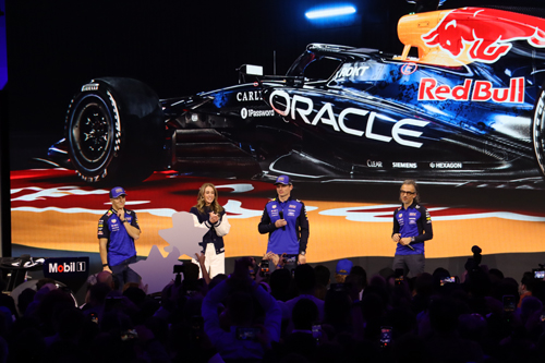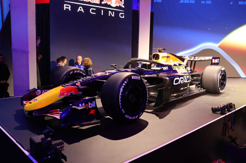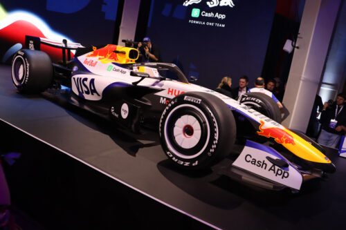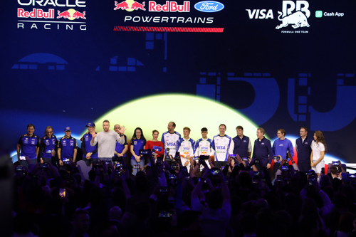 Ford CEO Jim Farley, VP Bill Ford and drivers Max Verstappen, Isack Hadjar, Liam Lawson and Arvid Lindblad all took the stage with an example each of the Red Bull Racing Team and the Visa CashApp Racing Bulls cars. The Red Bull Racing team – the main event, if you will – bears an obvious resemblance to the cars that preceded it, all dark blue with red and yellow Red Bull logos. The blue is a little lighter for this year – which is nice – but the real change happens over at Racing Bulls.