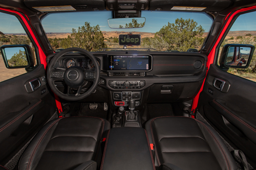 Inside, we find orange accents (of course), dash-mounted accessory rail, high back performance seats, locking door storage and Molle panels instead of a rear seat and custom rollbar. Oh, those crazy Jeep folks.
