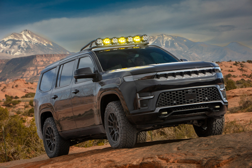The goal here was to think about off-roading, to be sure – this is a Jeep, after all – but to do it with a nod to the various premium features the Grand Wagoneer provides. So, they’ve given it a big roof-mounted light bar from Baja Designs, 35-inch tires wrapped around dark 20” wheels, custom skid plates and side graphics that feature a topographical map of the Cayonlands National Park, where the event takes place.