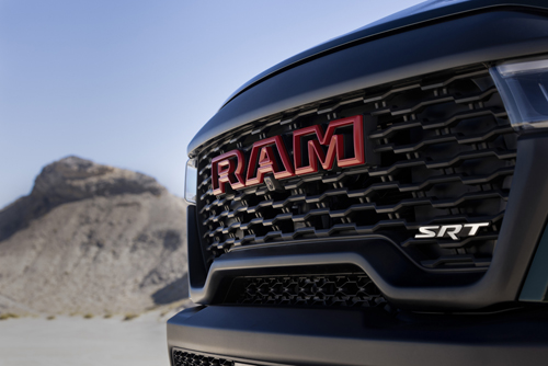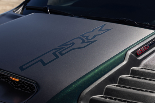 Skip the vinyl, and you’ll have to make do with the massive 35-inch Goodyear Wrangler Territory AT off-road tires, optional beadlock-ready 18” wheels and massive “Ram” front badge in red set against a blacked-out grille that looks like squashed honeycomb. The TRX SRT rides on Bilstein Black Hawk e2 shocks that provide 11.8” ground clearance. The TRX SRT will be available only as a Crew Cab with 5.7-foot box.
