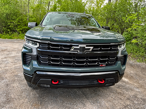 The glossy black front bumper is accentuated by bright red tow hooks, while the massive and tall front grille is as in-your-face as it gets—anchored by the large bowtie logo front and centre.