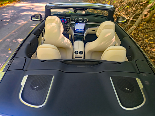 The large portrait-style infotainment screen delivers crisp graphics and thoughtful interface design. Apple CarPlay works flawlessly, though Mercedes’ native navigation is equally polished. The Burmester audio upgrade is rich and expansive, particularly impressive in a cabriolet where acoustics often struggle.