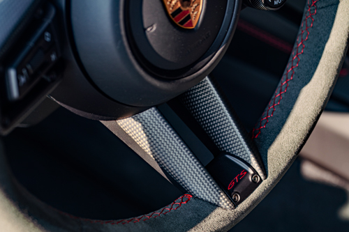 Step inside and the GTS makes its intentions clear. The GTS Interior Package combines Race-Tex microfiber upholstery with bold Carmine Red accents, including a central tachometer that serves as the focal point of the driver’s view. The effect is both sporty and premium, striking a tone that perfectly matches the car’s character.