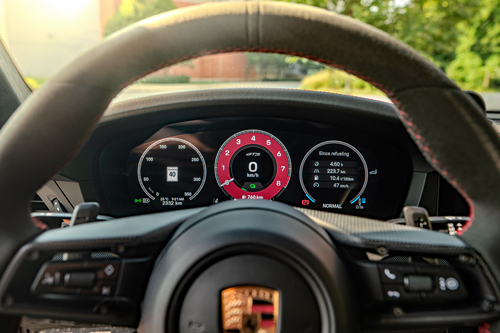 Comfort is not forgotten. The 18-way Adaptive Sport Seats provide excellent support during spirited drives while remaining comfortable enough for long-distance touring. Details such as noise-insulated lightweight glass and Race-Tex sun visors demonstrate Porsche’s obsession with the small things. Even the illuminated puddle lights projecting the Porsche crest remind you this is no ordinary 911.