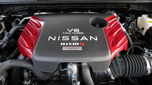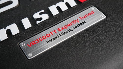You’d be mistaken in thinking that the switch to NISMO is merely a styling exercise (an overt styling exercise, indeed) and no more. The NISMO’s twin-turbo V6 that shares its basic architecture with the GT-R is tuned to make 460 horsepower and 516 pound-feet of torque. That means the NISMO is the most powerful Armada available and for the first time also makes more horsepower than the QX80. That specialness goes right down into the engine bay, where we find red header covers and a badge saying this particular VR35DDTT engine is “Expertly Tuned”. As you do.