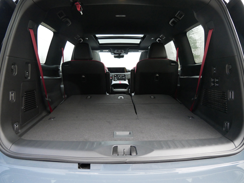 Both the second and third rows are mounted stadium-style, so much so that third-row occupants really look perched up there when seen from the front row. It makes for a seemingly larger cabin overall, a feeling somewhat sabotaged by the second row which could use a little more headroom. Both back rows do tilt, however, and since second-row captain’s chairs are your only option, accessing the third row is made that much easier.