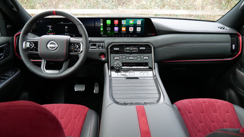There may be three exterior colour choices (five if you include the two-tone options), but the Armada NISMO’s interior is available one way, and one way only: charcoal-black leather with red suede inserts – that’s it…and that’s OK. Chances are, anybody buying a vehicle like this will be perfectly happy with such a brash interior colour choice.